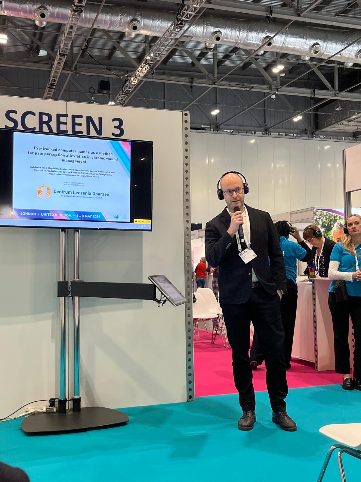 Wojciech Łabuś „Gry komputerowe sterowane ruchem gałek ocznych jako metoda łagodzenia bólu w leczeniu przewlekłych ran”, ang. „Eye-tracked computer games as a method for pain perception alleviation in chronic wound management” (prezentacja plakatowa)
