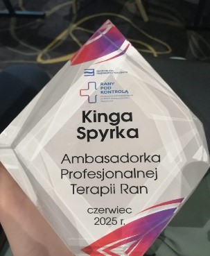 Dodatkowo gratulujemy Pani Kindze odebranej 3 czerwca 2025 r. statuetki Ambasadora Profesjonalnej Terapii Ran przyznanej w ramach pierwszej edycji ogólnopolskiego konkursu zorganizowanego w ramach kampanii „Rany pod kontrolą”. Nagrody zostały wręczone w Warszawie, podczas Posiedzenia Naczelnej Rady Pielęgniarek i Położnych. Laureaci zostali wyłonieni spośród zgłoszeń nadesłanych z całej Polski. Zgłoszenia były oceniane przez jury złożone z: mgr Marioli Łodzińskiej oraz mgr Jolanty Dynarskiej. Każde zgłoszenie oceniano zgodnie z precyzyjnym systemem punktowym.