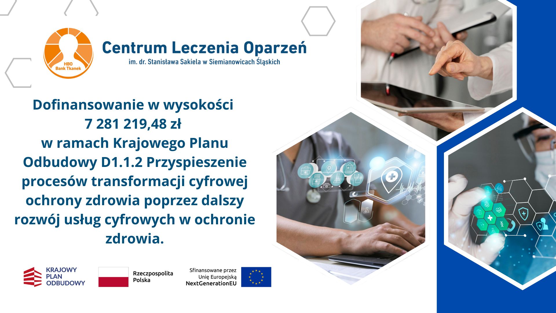 Z radością ogłaszamy, że Centrum Leczenia Oparzeń im. dr. Stanisława Sakiela w Siemianowicach Śląskich otrzymało projekt o wartości prawie 9 milionów złotych w ramach Krajowego Planu Odbudowy (D1.1.2 Transformacja cyfrowa ochrony zdrowia).